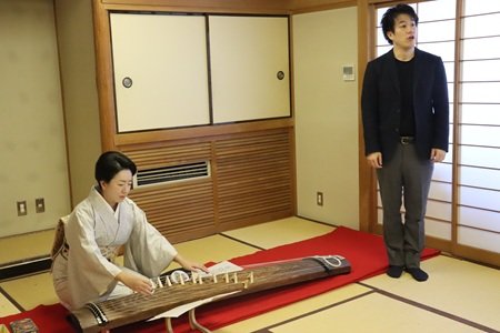 講義では、箏曲の歴史や楽器の構造、流派について、実演を交えながら分かりやすく解説していただき、続いて行われた演奏では、「六段の調べ」「水の変態」など3曲を披露いただきました。さらに、榎戸先生の東京藝術大学の後輩であり、現在は音楽家?テノール歌手として活躍されている曽部遼平氏も参加され、箏の演奏に合わせて、日本の名曲「ふるさと」を歌唱していただきました。箏と声楽が織りなす温かみのある響きに、参加者は深く聴き入っていました。その後、参加者全員で「ふるさと」を合唱し、会場が一体となる印象的なひとときとなりました。