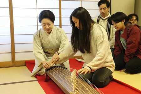 講義後には、実際に箏に触れて演奏を体験する時間も設けられ、初めて演奏する参加者は、榎戸先生から直接指導を受けながら日本の伝統楽器が持つ音の美しさと奥深さを実感していました。