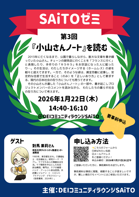 | 場所 | DEIコミュニティラウンジSAiTO (研究機構棟3階309) |